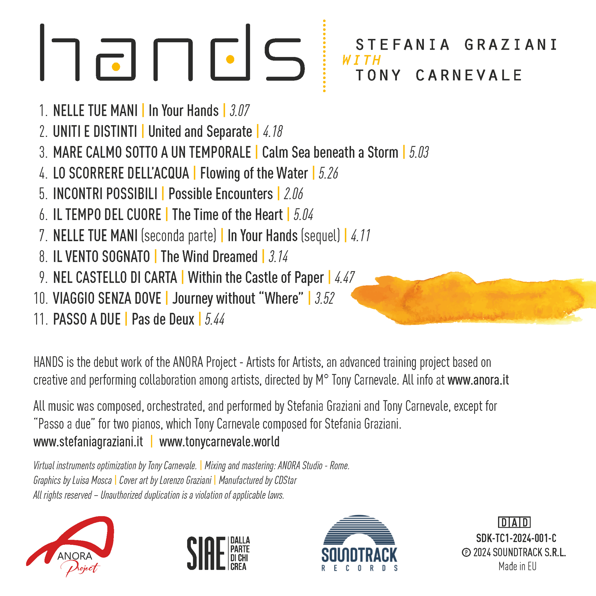 HANDS è anche il primo disco che Stefania Graziani pubblica con SOUNDTRACK Records, casa discografica guidata da Massimo Pontoriero, con la quale Tony Carnevale ha già pubblicato altri due lavori personali. Il nuovo disco è composto da undici brani strumentali per pianoforte e altri strumenti; è musica di libera espressione artistica, svincolata dai condizionamenti del mercato, ma allo stesso tempo assolutamente fruibile e comunicativa, soprattutto dal punto di vista emozionale. È anche difficilmente riconducibile a un genere preciso ma, se proprio la si dovesse definire, si potrebbe collocarla tra la musica classica contemporanea e il sinfonismo moderno, certamente vicina anche all’ambito delle colonne sonore.